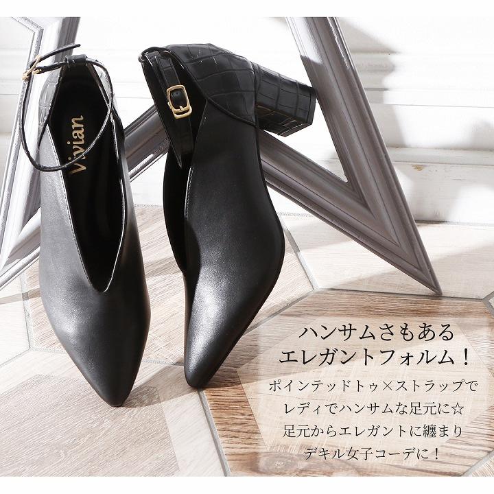 パンプス 痛くない 黒 アンクル ストラップ ポインテッドトゥ Vカット チャンキーヒール 6cm ヒール 歩きやすい ブラック 黒 ブラウン パイソン柄 通勤 オフィス V8404al Vivian Collection 21 26cm対応 通販 Yahoo ショッピング